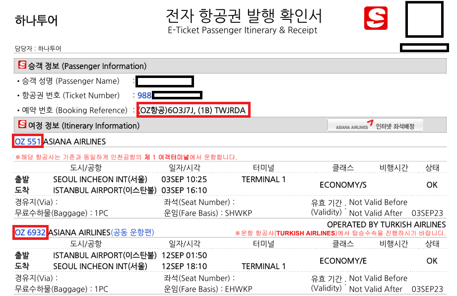 3️⃣ 여행사 통해 예약번호를 확인해보니까, 아시아나에서 받은 예약번호랑 터키항공에서 쓰는 번호(235~로 시작)가 서로 달라요.